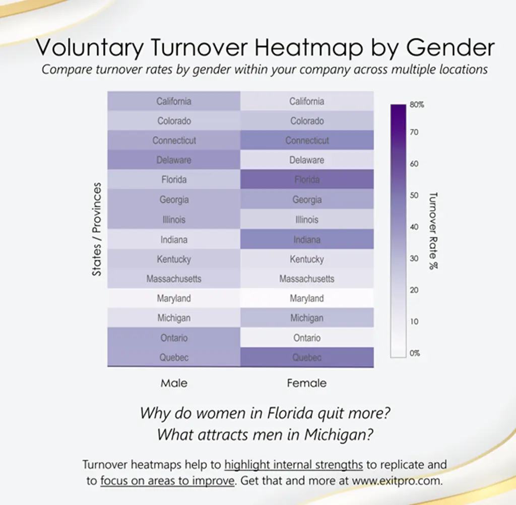 STOP DROP AND ROLL Because ExitPro’s Turnover Heatmap is ON FIRE! Turnover rate is the most mislead business statistic. It’s not about everyone who quits. It’s about exactly who quits. Compare employee turnover rates by gender across multiple locations. This turnkey dashboard provides answers to retention questions. “Why do women in Florida quit more?” “What attracts men in Michigan?” “Where can I get ice cream?” ExitPro’s Voluntary Turnover Heatmap compares staff attrition by: Age, Gender, Tenure, Location, Title, Department etc. These retention insights reveal the areas of strength to replicate and the places in most need of improvement to retain your employees. Put out your employee fires at www.exitpro.com.