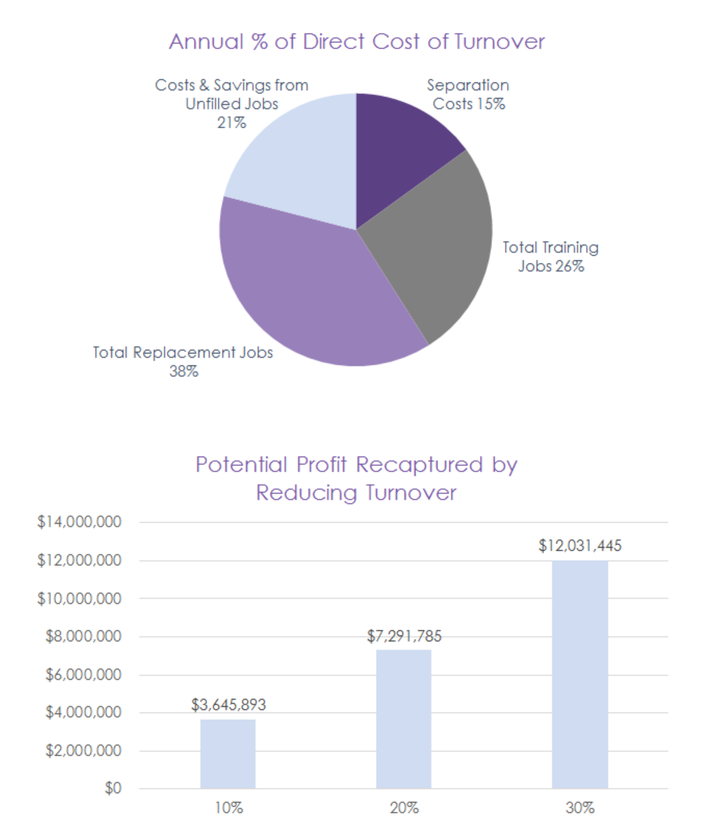- Direct Cost of Turnover: Job board/posting fees, candidate screening and hiring process time, training and orientation of new hires and many more.
